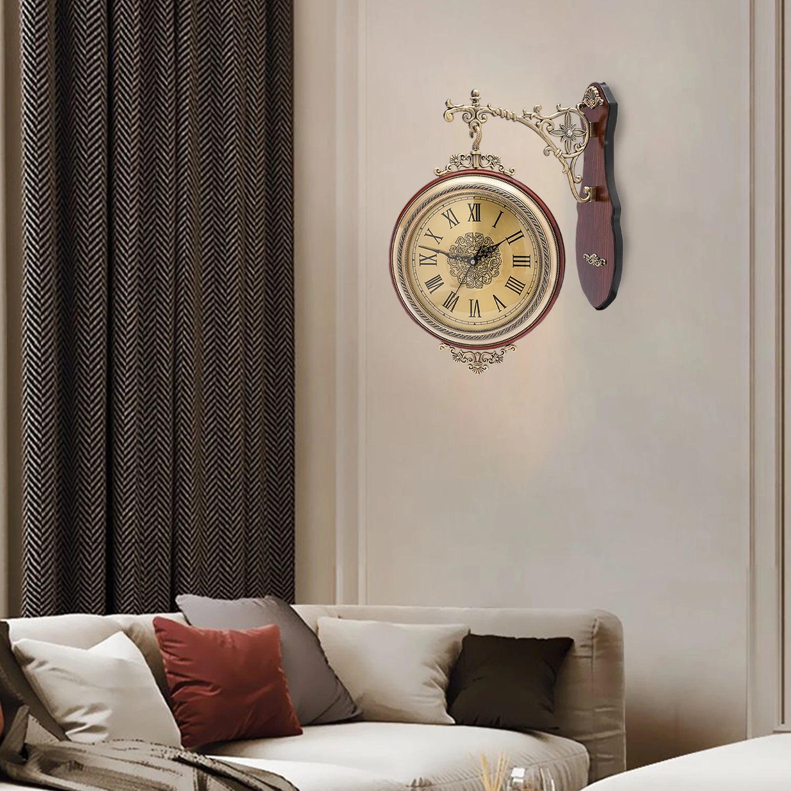 European Art Wall Clock Silent Retro Large Metal Wood Double Sided Wall Clock Living Room Home Decor